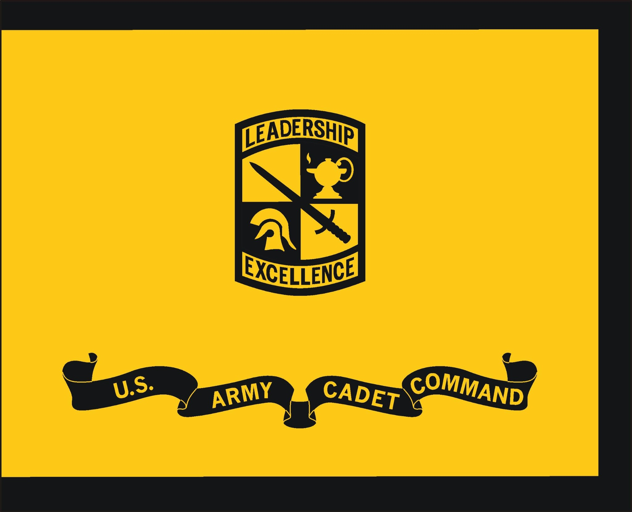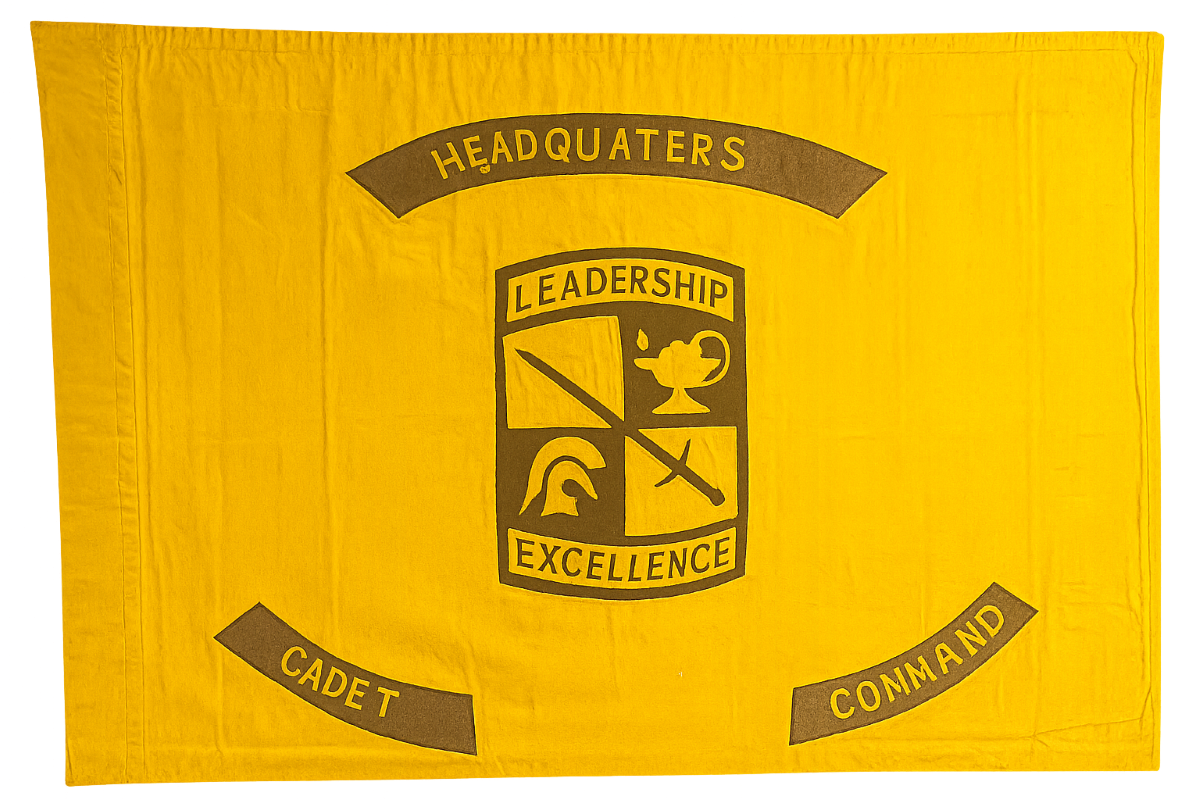 The organizational color of the U.S. Army Cadet Command is a yellow flag with a black fringe, measuring 36 inches by 48 inches. In the center of the flag is the shoulder sleeve insignia of the command in proper colors, 15 inches high. Centered below the shoulder sleeve insignia is a black designation scroll inscribed "U.S. ARMY CADET COMMAND" in yellow.